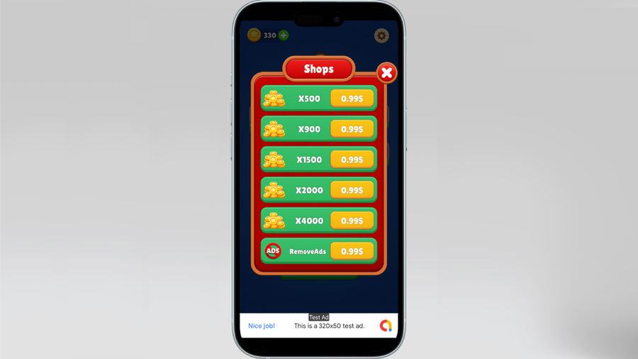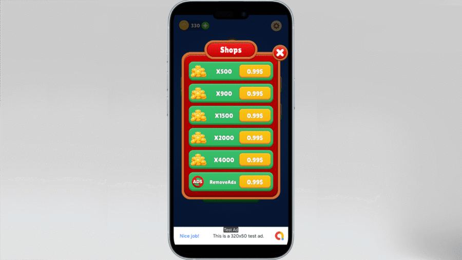 Unity IAP Systems: Players can purchase coins on the in game store, Remove Ads.