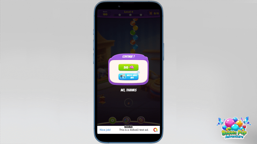 • Rewarded Ads (get coins free, keep continue game)