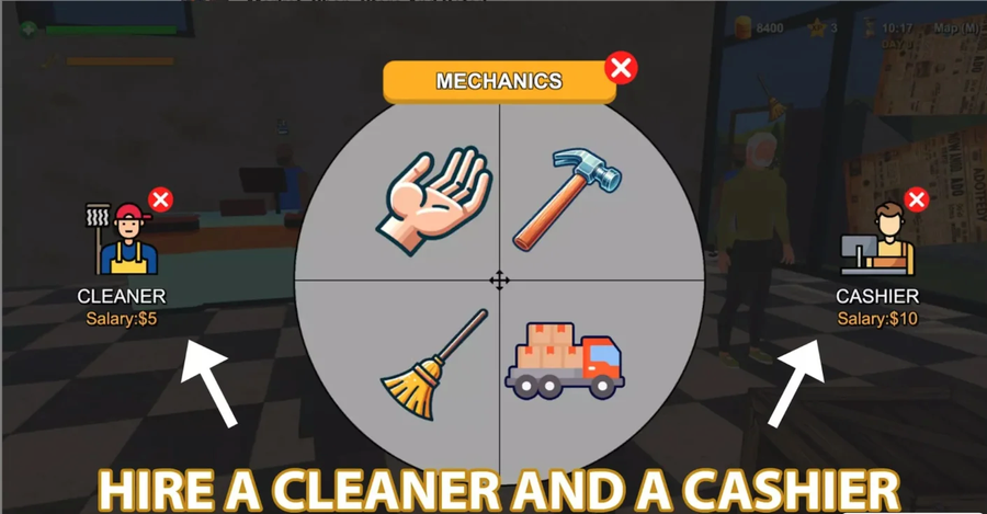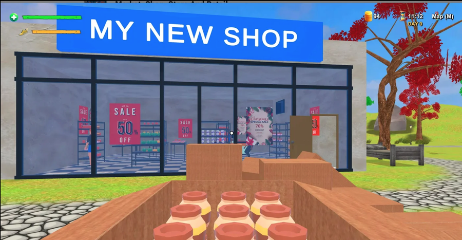 - Shop Setup: Purchase shelves, corner racks, tables, cashier areas, and more to set up your store.