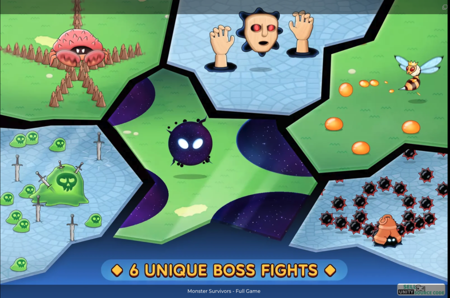 Monster Survivors is a complete 2D horde survival game, inspired by Vampire Survivors and Survivor.io. Suitable for developers of most skill levels, from beginner to pro. Includes everything you need to start building your own game of this genre: player movement, abilities, enemy behaviors, boss fight mechanics, stage creator, and so much more – all with original art. ? Demo WebGL ? Demo Android ? Documentation ? Discord ? octbrstudio@gmail.com Template Features: ?Compatible with Unity 6 ??Easily Customizable ??????? ???? ???? ?????? Swap character, enemy, stage, and ability visuals in a few clicks ??????? ???? ???? ?????? Change stats for every ability, enemy, character or boss with ease ??????? ???? ???? ??????? Create stages fast using a visual timeline ??????? ???? ???? ??????? Tune tempo and difficulty of the game to your desires ?Abilities ??????? ???? ???? ?????? 36 abilities (12 Active, 12 passive, 12 evo) ??????? ???? ???? ?????? Icons and vfx included ??????? ???? ???? ??????? Customizable ability stats ??????? ???? ???? ?????? In-game ability selector ?Enemies ??????? ???? ???? ?????? 14 animated enemies included ??????? ???? ???? ?????? Customizable enemy stats (damage, speed, hp, drop) ??????? ???? ???? ?????? Disolve shader for all enemies (death animation) ??Bosses ??????? ???? ???? ?????? 6 animated bosses included ??????? ???? ???? ?????? Unique mechanics for each boss (15 in total) ??????? ???? ???? ?????? Customizable boss fight arena ?Drop ??????? ???? ???? ?????? 4 xp gem tiers ??????? ???? ???? ??????? bomb ??????? ???? ???? ?????? magnet ??????? ???? ???? ??????? heal ??????? ???? ???? ??????? coins ??????? ???? ???? ??????? chest ??Stage Creator ??????? ???? ???? ??????? Unity Timeline based, features: ??????? ???? ???? ???????????? ???? ???? ?????? Wave track (Burst spawn, continuous spawn, maintain enemy count) ??????? ???? ???? ???????????? ???? ???? ?????? Camera track (Dynamic camera control) ??????? ???? ???? ???????????? ???? ???? ??????? Boss track (Boss fight control) ??????? ???? ???? ??????? 4 Different Stages Shapes (Endless, Square, Horizontal, Vertical) ?Upgrades ??????? ???? ???? ??????? Expandable upgrade system, allows permanent progression ??????? ???? ???? ??????? Included upgrades: ??????? ???? ???? ???????????? ???? ???? ??????? Revive ??????? ???? ???? ???????????? ???? ???? ?????? Armor ??????? ???? ???? ???????????? ???? ???? ??????? Damage ??????? ???? ???? ???????????? ???? ???? ?????? Healing ??????? ???? ???? ???????????? ???? ???? ??????? Health ?User interface ??????? ???? ???? ?????? Includes multiple UI screens across the game: ??????? ???? ???? ???????????? ???? ???? ?????? In-game experience panel ??????? ???? ???? ???????????? ???? ???? ??????? Ability selector ??????? ???? ???? ???????????? ???? ???? ??????? Chest window ??????? ???? ???? ???????????? ???? ???? ??????? Main menu ??????? ???? ???? ???????????? ???? ???? ??????? Settings ??????? ???? ???? ???????????? ???? ???? ?????? Upgrades ??????? ???? ???? ???????????? ???? ???? ??????? Character selector ??????? ???? ???? ???????????? ???? ???? ??????? Pause ??????? ???? ???? ???????????? ???? ???? ?????? Stage complete ??????? ???? ???? ???????????? ???? ???? ?????? Stage failed ?Chest system ??????? ???? ???? ??????? Animated chest opening ??????? ???? ???? ??????? Dynamic tier system (different reward and visuals for each tier) ?Multi platform features ??????? ???? ???? ?????? Supports IOS, Android, WebGL, and Windows ??????? ???? ???? ??????? Cross platform save system with resume feature ??????? ???? ???? ?????? Vibration ??????? ???? ???? ?????? Audio