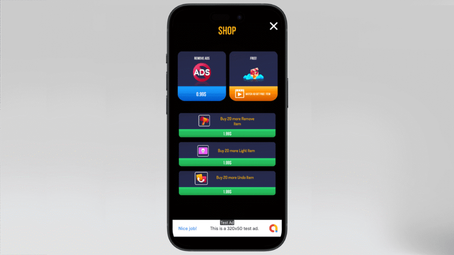 - Unity IAP Systems: Players can purchase Booster on the game store, RemoveAds.