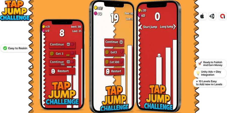 Tap Jump Challenge is a fully developed Unity 2D casual endless game, designed for quick publishing on Google Play and the App Store.